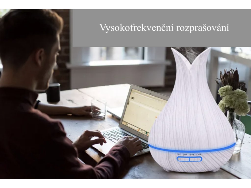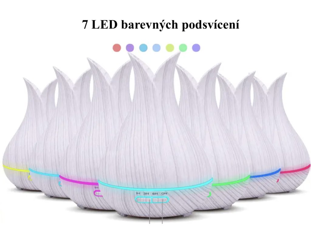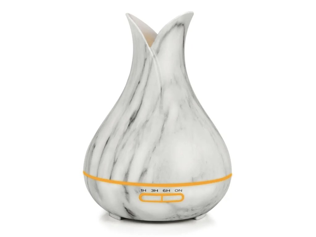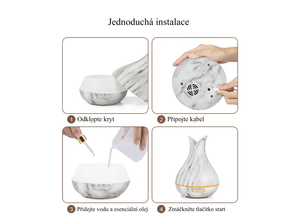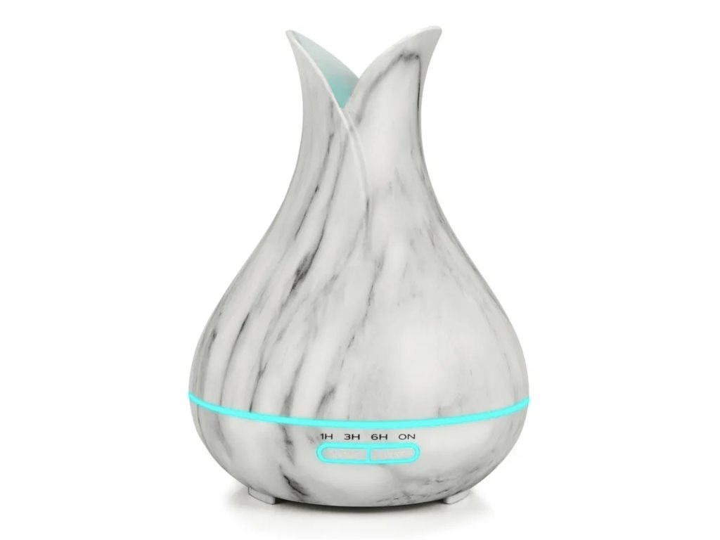 Tartály térfogata 400 ml, 7 színű háttérvilágítás, üzemidő 12 óra, vezérlés távirányítóval és a diffúzoron lévő gombokkal, háttérvilágítás és időzítés ki- és bekapcsolása, színe fehér márvány.