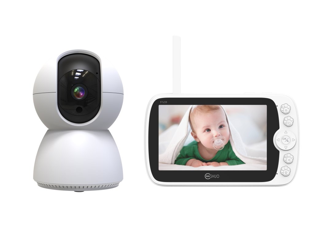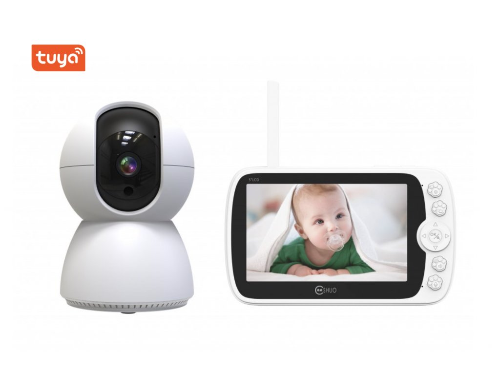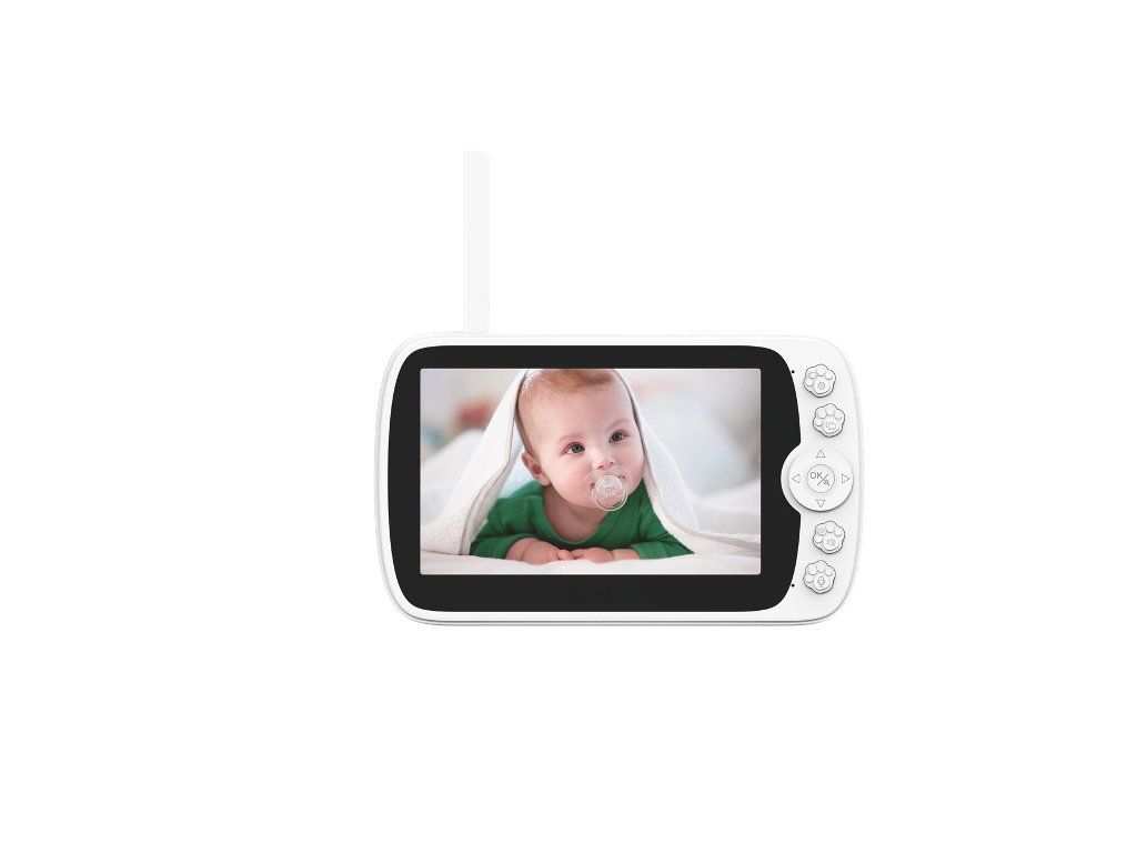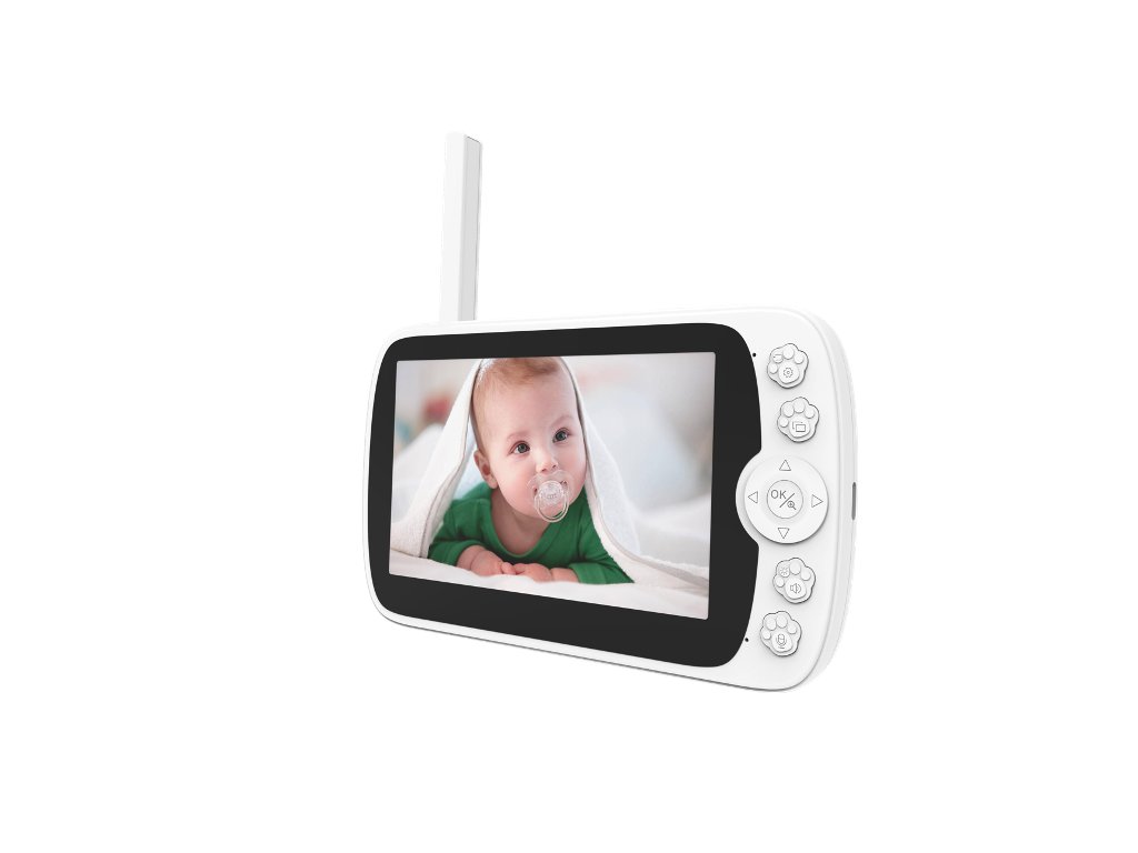 Babaőrző kamerával, WiFi 2,4 GHz, Full HD (1920 x 1080), tuya Smart / Smart Life mobilalkalmazás, éjjellátó, nyolc beépített altatólámpa, kétirányú kommunikáció 100 méterig, hőmérséklet-ellenőrzés, 5" LCD kijelző, fehér.