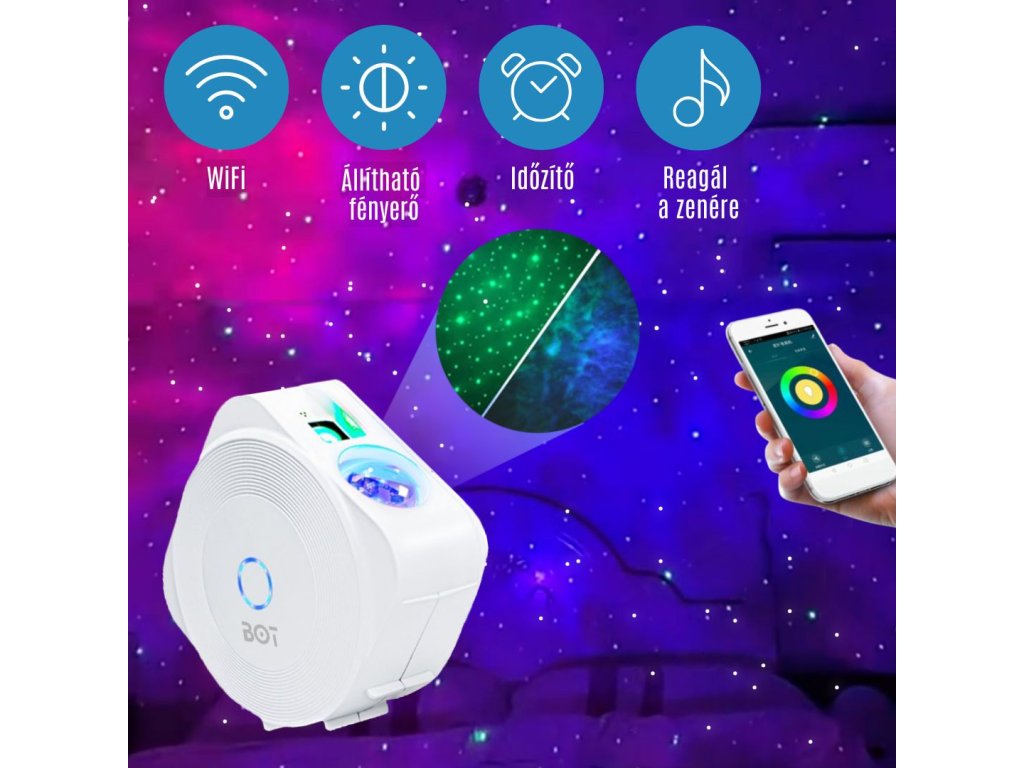 Egy egyszerűbb, alkalmazásvezérlés nélküli projektort keres? A kivetítő nagyon jól szolgál Holdnyuszi MB1. Ha értékelné, hogy a projektorhoz integrált hangszóró is tartozik, amely zenét vagy történetet játszik le a telefonról, majd válassza ki az egyik típust Dinoszaurusz tojások. Ha keres a projektorok "okosabb" változata, akkor nyúlhatsz a BOT Éjszakai égbolt projektor S1. Abban az esetben, ha a kivetítéstől is vársz a zene ritmusára reagálva, amit játszol, választhat BOT Éjszakai égbolt projektor S2. A legjobb ajánlatot szeretné? Akkor az Ön számára megfelelő lehet a BOT Éjszakai égbolt projektor S3, amely a beépített bölcsőnek köszönhetően a legjobban állítható vetítési szöggel rendelkezik, kis dőlésszögváltoztatás lehetőségével (az S1 és S2 projektorok 3 szintes szögbeállítással rendelkeznek). Az S3 fehér és kék színben kapható, az alkalmazással és a hangasszisztensekkel vezérelhető, és a vetítést is képes a lejátszott zene ritmusához igazítani.