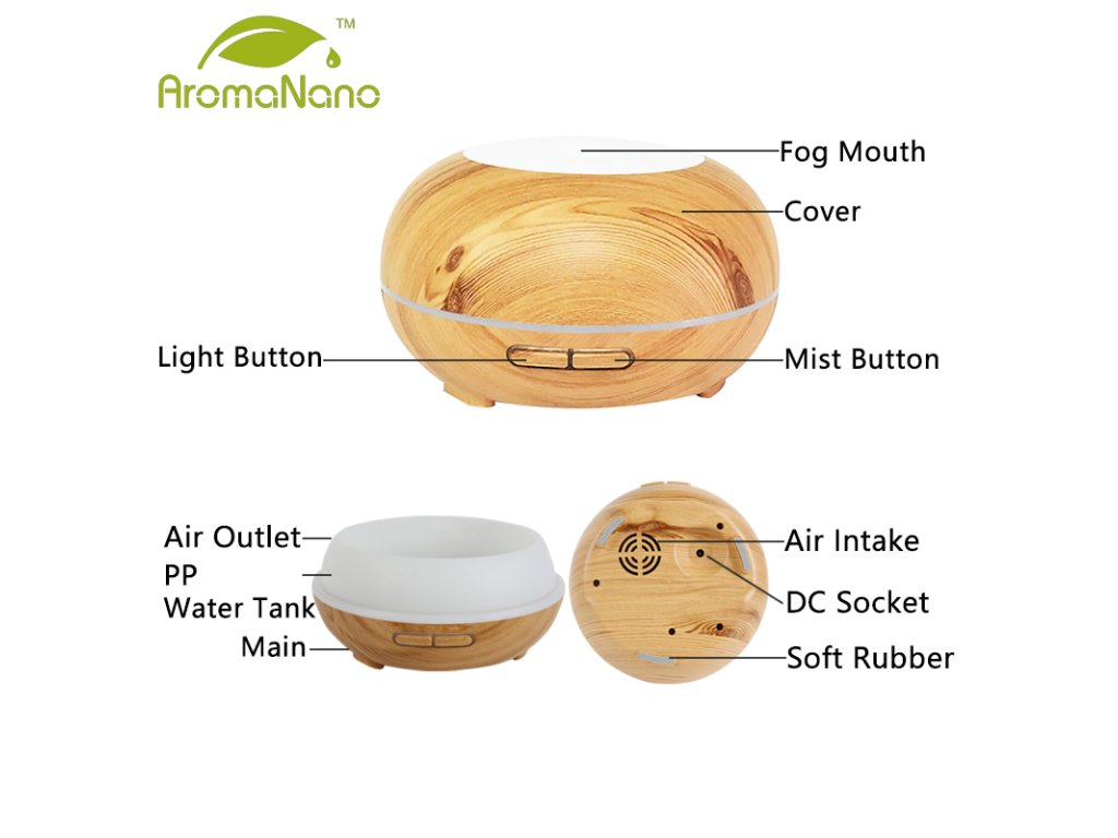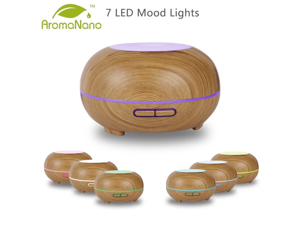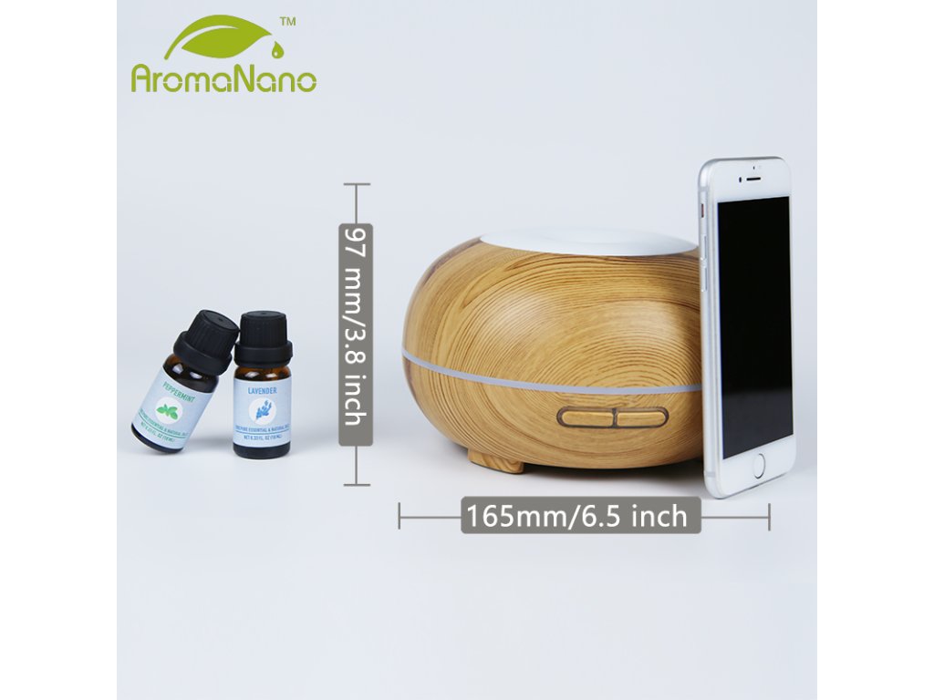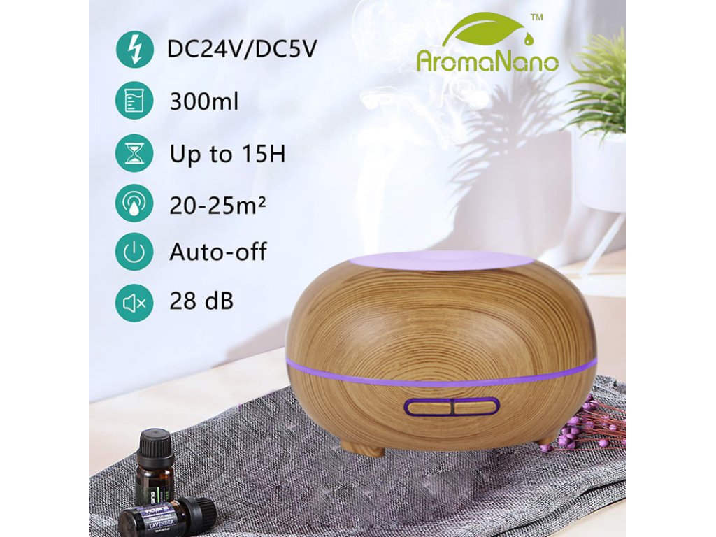 Intelligens aromadiffúzor, 300 ml-es tartály térfogata, 7 színű háttérvilágítás, akár 15 órás üzemidő, WiFi, háttérvilágítás és ki/be kapcsoló időzítő, világosbarna fa színben