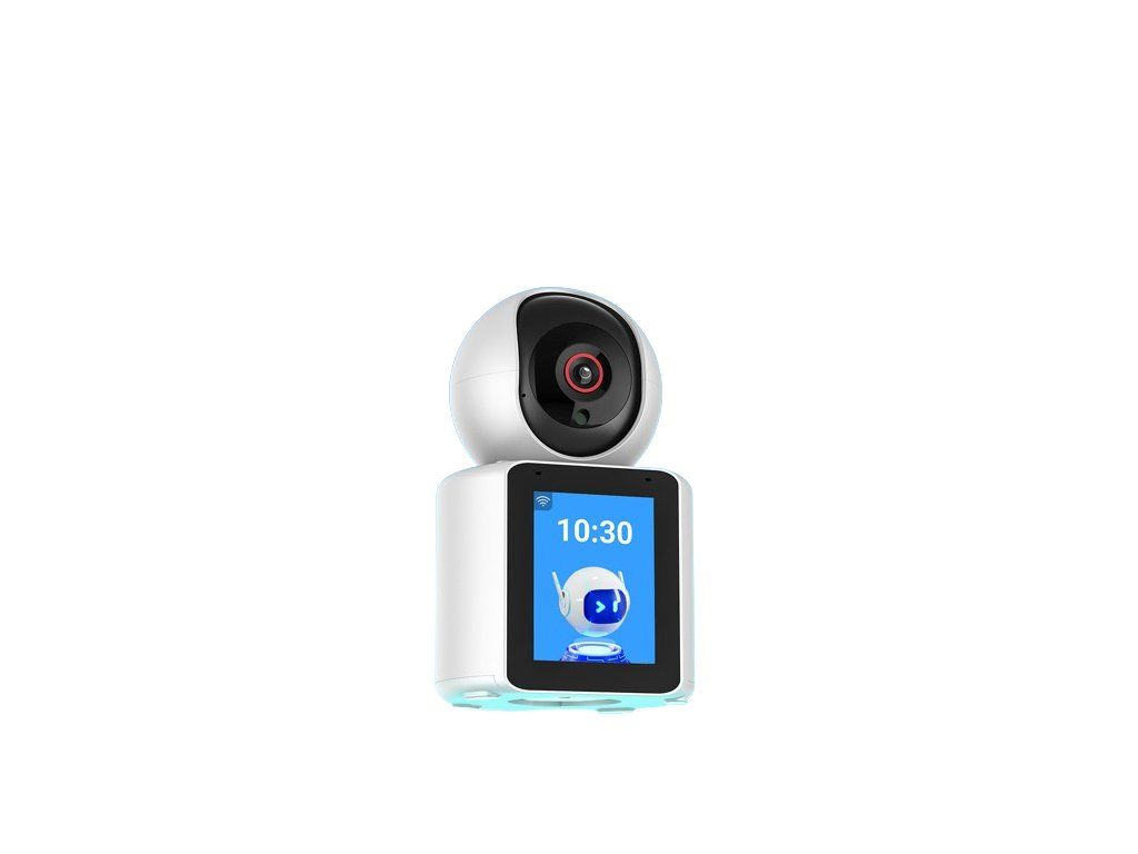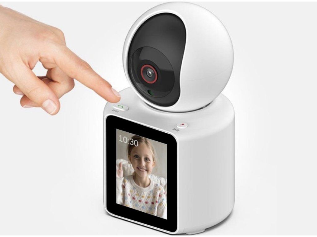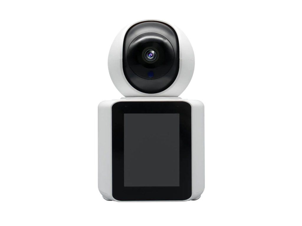 Intelligens beltéri kamera kijelzővel és híváskészséggel, alkalmas videohívásokhoz gyerekekkel, idősekkel vagy munkahelyi környezetben, WiFi, FullHD 1080p, 350° vízszintes forgatás és 60° függőleges dőlésszög, Im Cam mobilalkalmazás, kétirányú kommunikáció, 2,8 hüvelykes (7,11 cm) IPS képernyő, USB-C tápegység, fehér kivitel.