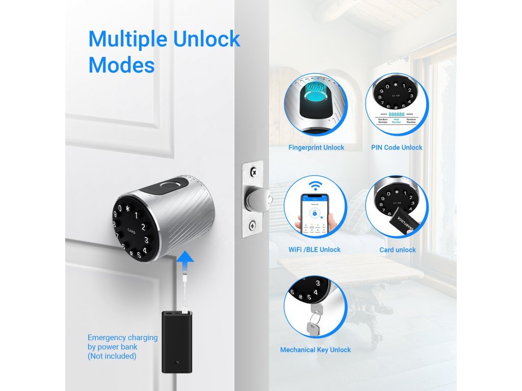 1. Flexibilní ovládání: odemykejte dveře pomocí Bluetooth technologie na mobilním telefonu, na dálku přes WIFI gateway (potřeba dokoupit zvlášť), otiskem prstu nebo číselným kódem.