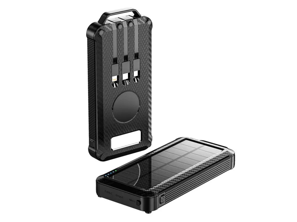A napelemes energiabank két lítium-polimer akkumulátorból áll, amelyek összmérete 10 000 mAh. A napelemes energiatároló fennmaradó kapacitása 5 LED segítségével ellenőrizhető. A két USB-bemenetnek köszönhetően egyszerre két eszköz csatlakoztatható. Ez a termék akkor is alkalmas, ha úton van, mivel IP67-es vízálló védelemmel rendelkezik. Ezen kívül egy fényszóró is található az alján.