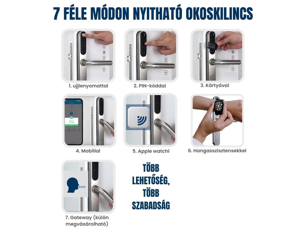 ZigBee / WiFi okos kilincs, beltéri és kültéri használatra alkalmas, Tuya alkalmazáson keresztül vezérelhető, 7 egyszerű feloldási mód: mobiltelefonnal, PIN-kóddal, ujjlenyomattal, chipkártyával, Apple Watch használatával, távolról átjárón (gateway) keresztül, illetve hangasszisztensekkel, hengerfurat nélkül, ajánlott ajtóvastagság 35-75 mm (hosszabbító készlettel 120 mm-ig), jobb és bal oldali tájolás, 4 AA elemmel működik, ezüst színű