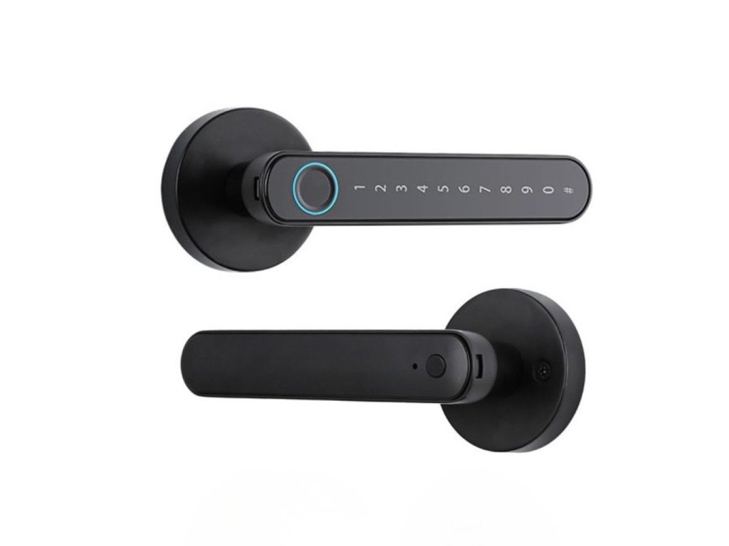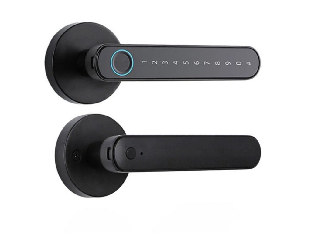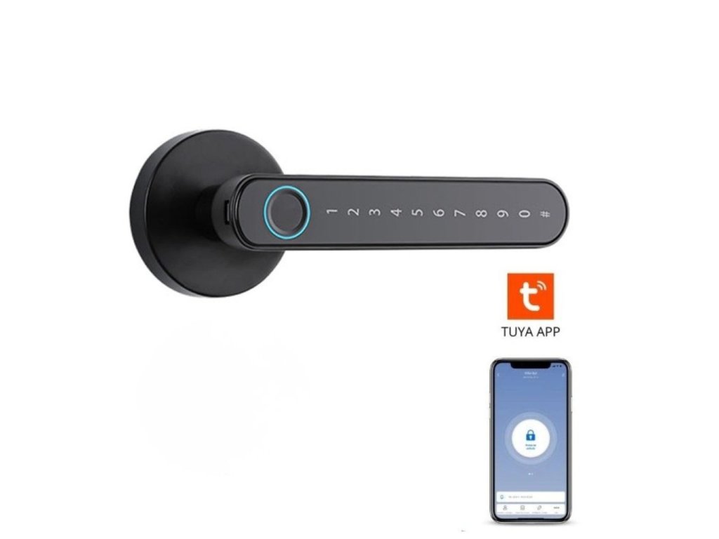 Bluetooth/WiFi intelligens kilincs, vezérlés Tuya Smart/Smart Life mobilalkalmazással, 4 feloldási lehetőség (kulcs, ujjlenyomat, numerikus kód, mobiltelefon), automatikus zárási funkció, jobb és bal tájolás, 4 AAA elemmel működik, fekete színű.