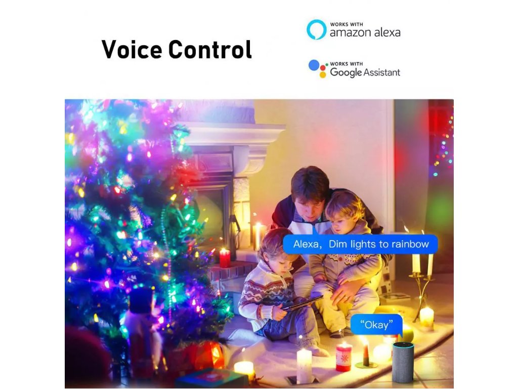 A lánc háromféleképpen vezérelhető: közvetlenül az adapteren, távirányítóval vagy mobiltelefonon keresztül a Tuya Smart alkalmazással. Fontos funkció, amelyet minden bizonnyal különösen a partizók fognak értékelni, a lánc vezeték nélküli összeköttetése a mobiltelefonnal. A lánc a Tuya Smart alkalmazáson keresztül vezérelhető (így kompatibilis az Amazon Alexa és a Google Assistant alkalmazással). A lánc a LED színeivel szinkronizált zenével rendelkezik, váltogatja a színeket, és fényerősségét tompíthatja vagy időzítőre állíthatja. Lehetőség van tehát arra, hogy a lejátszott zene ütemére válaszul színváltozást állítson be. A vezérlési hozzáférést meg lehet osztani, így nem kell harcolni az irányításért. A szórakoztató LED-lánc színei akár 16 millió különböző variációból is választhatóak. A hangvezérlés az Alexához vagy a Google Assistanthoz csatlakoztatva lehetséges.