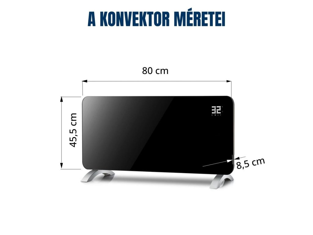 - Méretek (2000 W-os modell): 80 x 45,5 x 8,5 cm (Sz x H x D)