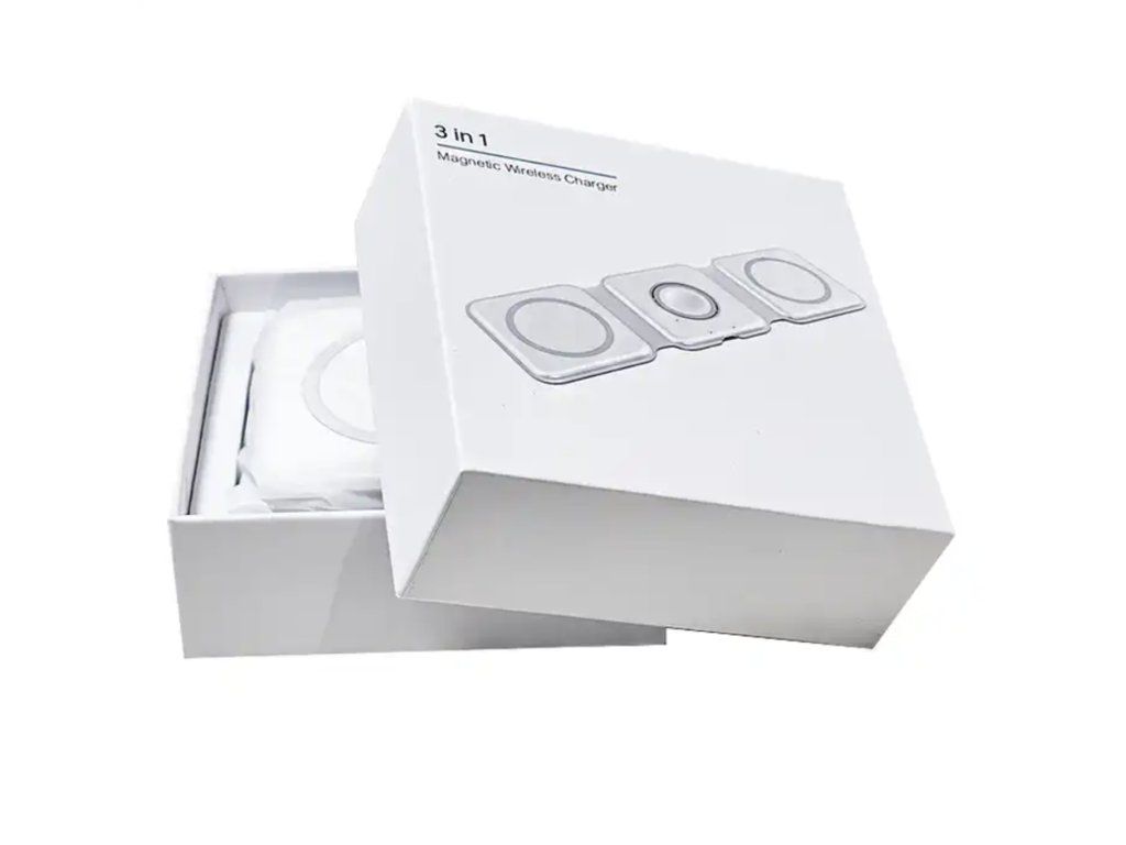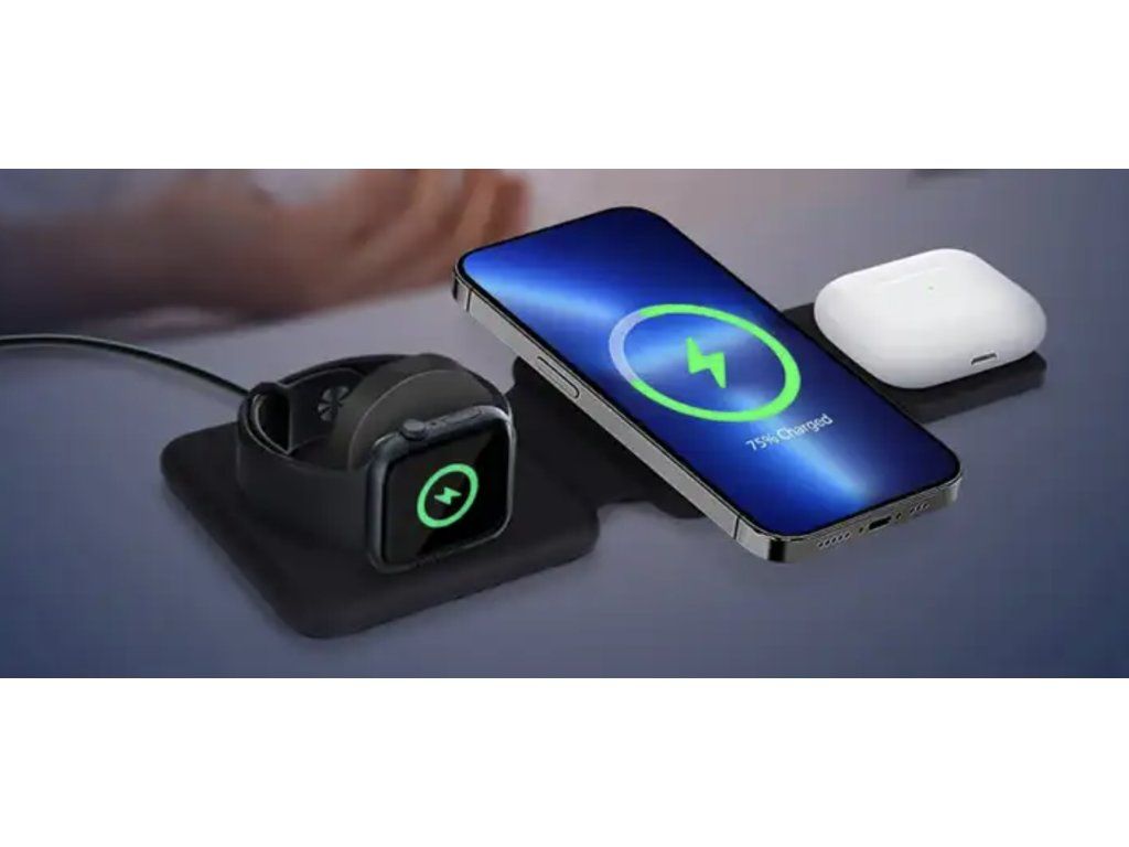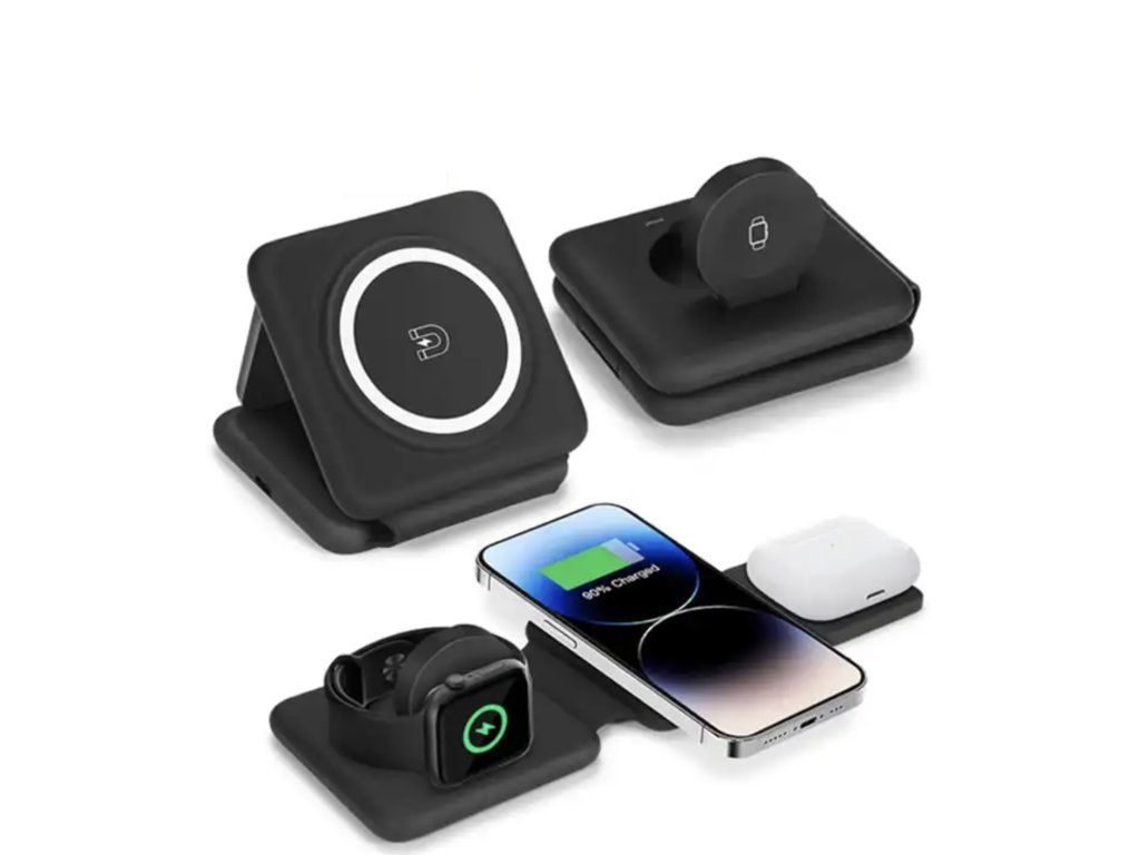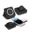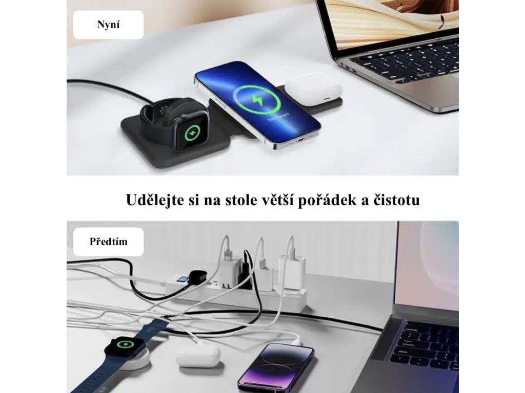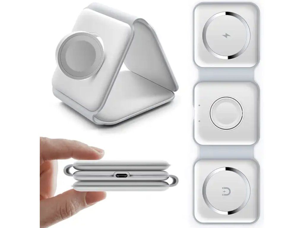 3 az 1-ben vezeték nélküli töltőállomás gyors töltéstámogatással, mobiltelefon, óra és fejhallgató vezeték nélküli töltésére tervezve, uSB-C bemenet, 3 kimenet (15 W, 3 W és 2,5 W), alkalmas Apple termékek töltésére, alul- és túlfeszültség elleni védelem, fekete-fehér kivitel.