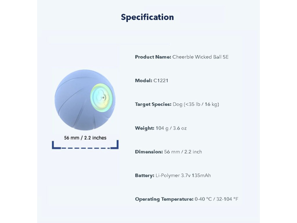 Ez az interaktív labda megszünteti kedvence magányosságának és unalmának érzését, amikor Ön távol van. Megadja neki azt a szórakozást, interakciót és mozgást, amire akkor is vágyik, amikor Ön nincs a közelben. A labda 3 reakciómódra állítható be: gyengéd, normál és aktív.