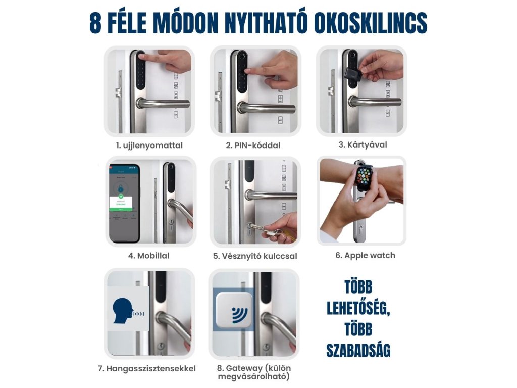 A TTLock HD1 modell kényelmes és biztonságos hozzáférést biztosít több modern feloldási módszerrel. A kilincs támogatja a nyitást hagyományos kulccsal, ujjlenyomattal, PIN kóddal, chipkártyával, mobiltelefonnal, Apple Watch-csal, hangasszisztensekkel vagy távolról Wi-Fi gatewayen keresztül.