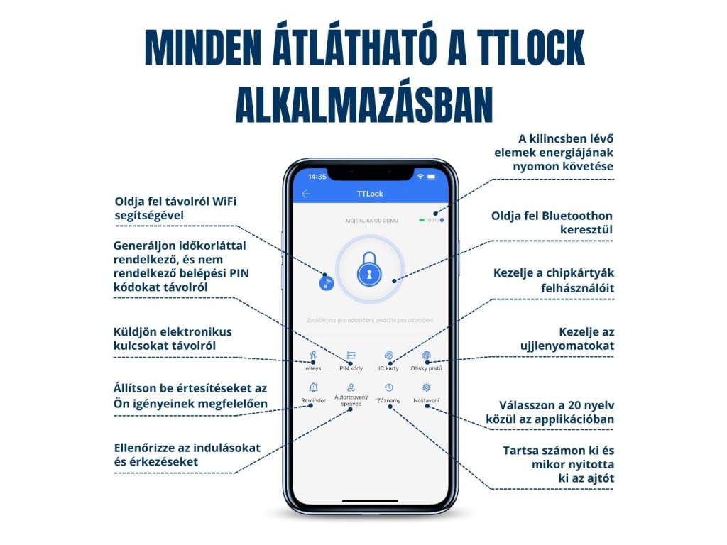 A TTLock HM1 modell kényelmes és biztonságos hozzáférést biztosít több modern feloldási módszerrel. A kilincs támogatja a nyitást hagyományos kulccsal, ujjlenyomattal, PIN kóddal, chipkártyával, mobiltelefonnal, Apple Watch-csal, hangasszisztensekkel vagy távolról Wi-Fi gatewayen keresztül.